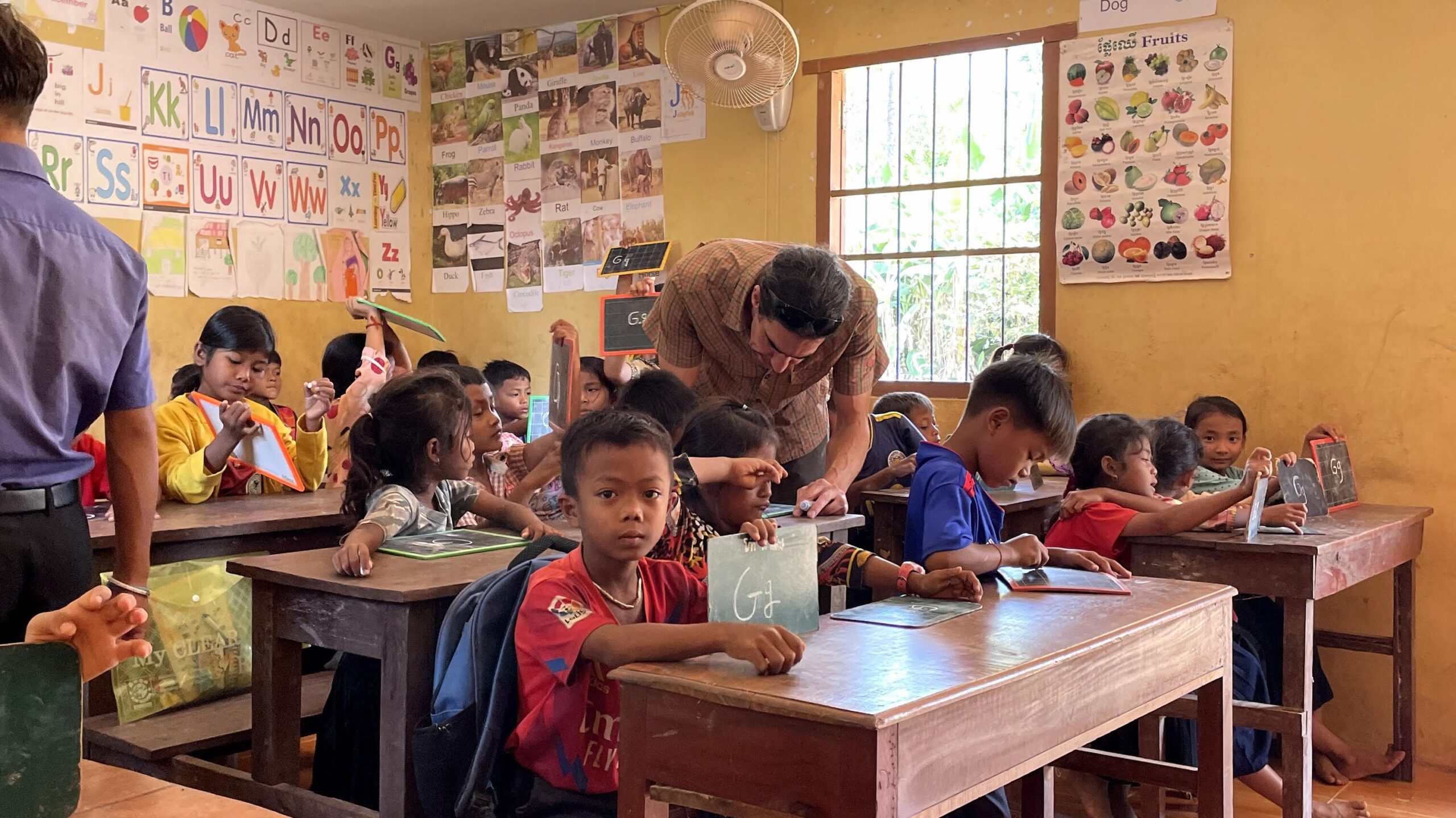 My second engagement took me to PCEF School in Lvea, a small village near Siem Reap. This was a completely different setup compared to my previous experience in Laos. Here, I found an actual school with around 360 students, complete with classrooms, desks, a whiteboard, local teachers, and also learning materials, including little private chalkboards for practicing writing.